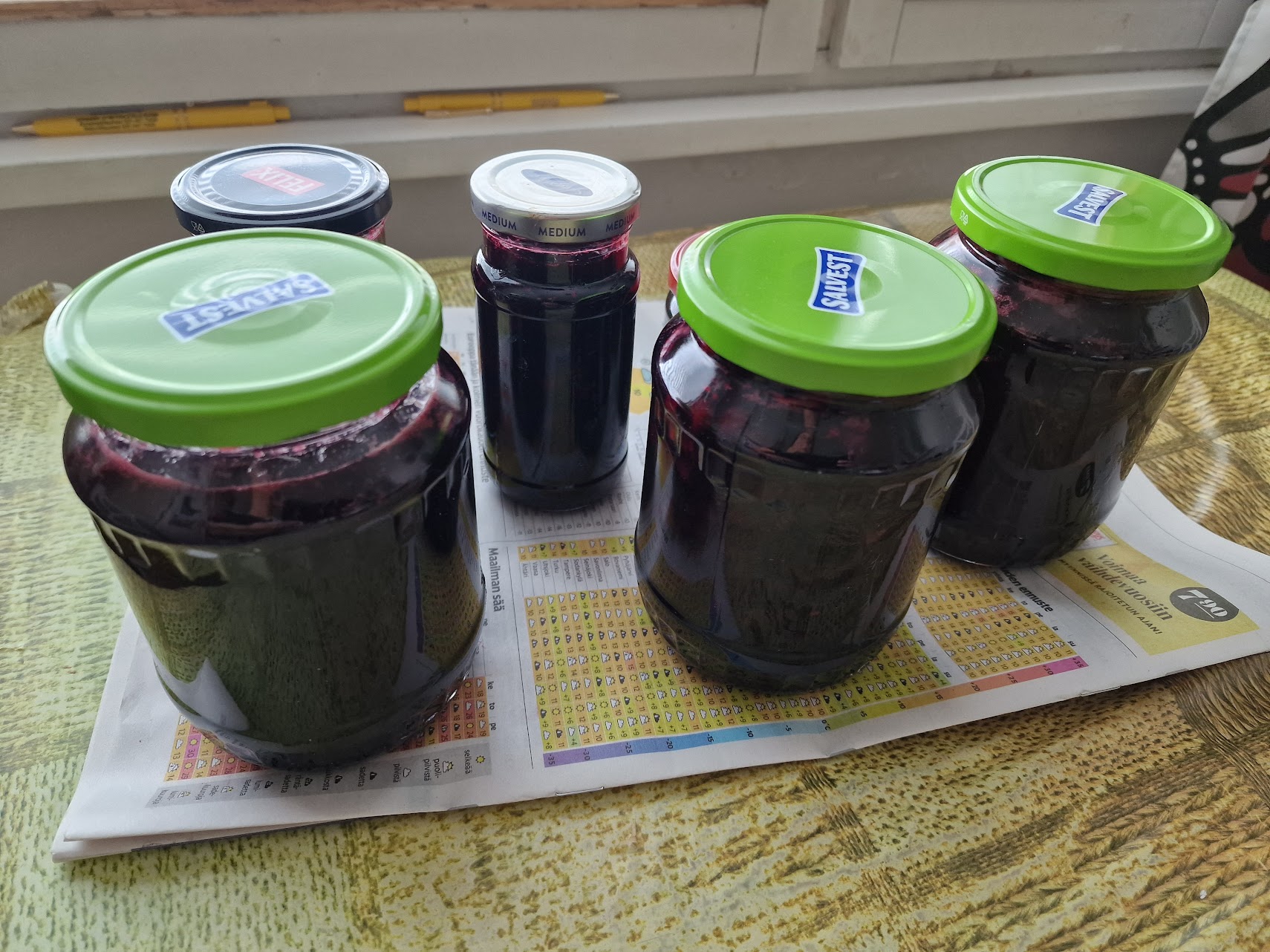 Perille päästyämme en paljoakaan ehtinyt auttaa auton purkamisessa, koska minun oli kiirehdittävä iltavuoroon töihin. Heti seuraavana vapaapäivänäni keitin tuomamme aroniat hilloksi. Kaalinkerät riittivät hyvin yhteen kaalilaatikkoon, Kesäkurpitsat olivat niin suuria, että puolikas riitti yhteen kasvislasagneen. Jotain hyödyllistä olemme sentään saaneet kasvamaan, vaikka valitettavasty myös rikkaruohot ovat tänä vuonna kasvaneet aivan erityisen hyvin. Kurkuntaimet eivät alkukesän kylmyyden vuoksi jaksaneet tuottaa kuin yhden pienen yksilön malliksi, mutta rikkaruohoista kurkkumaa oli vihreänään. Toivottavasti tuleva kesä on tuottoisampi.